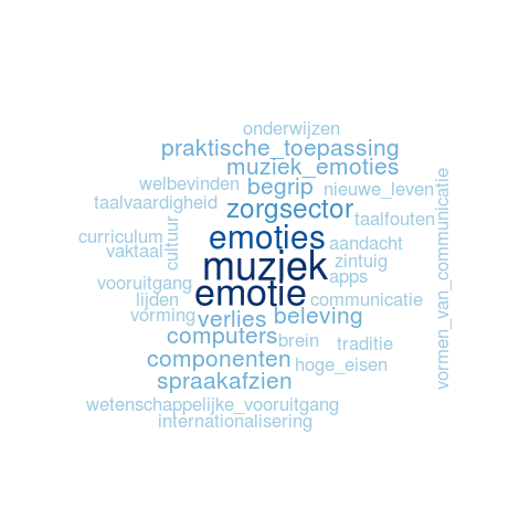 begrip beleving componenten computers emotie emoties muziek muziek_emoties praktische_toepassing spraakafzien verliesVoor mensen die doof worden is na het verlies van spraakverstaan het belangrijkste verlies de muziek, en in het bijzonder van de emoties die muziek oproepen. Spraakverstaan blijkt (na training) mogelijk te zijn via visuele stimuli (spraakafzien) .Sinds computers de mogelijkheden bieden worden pogingen gedaan om \u20ac\u0153visuele muziek\u20ac te produceren, maar deze leiden niet tot de bijbehorende emoties. Om muziek werkelijk te kunnen vertalen naar visuele stimuli die de emoties prikkelen zal eerst begrepen moeten worden hoe muziek die emotie creert (ritme, timbre, majeur/mineur etc?). Daarover blijkt verrassend weinig bekend te zijn. Dit onderzoek levert dus allereerst een fundamentele bijdrage aan ons begrip van de hersenen.Wanneer vervolgens de relevante componenten van de muziek omgezet kunnen worden in de juiste vervangende visuele stimuli, komt ook de praktische toepassing voor doven in zicht (mogelijk net als bij spraakafzien na een trainingsprogramma). Hiermee kunnen de doven weer profiteren van werken van geweldige componisten van de afgelopen eeuwen.Ultimo wordt het misschien ook mogelijk worden om nieuwe puur visuele \u20ac\u0153muziek\u20ac te componeren die ook voor horenden een beleving kan zijn: een heel nieuw cultureel medium.